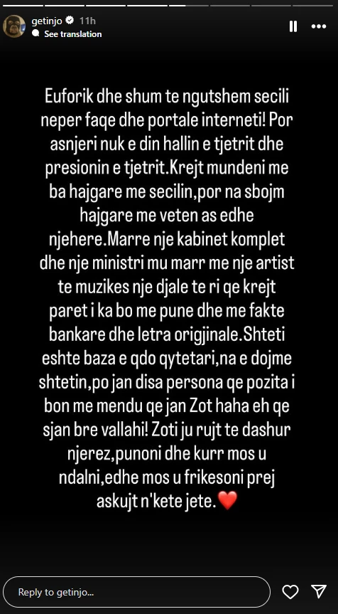Pas polemikave të fundit lidhur me orën luksoze dhe akuzat që Mozzik bëri ndaj Vetëvendosjes, ka reaguar edhe vëllai i tij, reperi Getinjo. Ai ka përdorur rrjetet sociale për të…