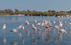 pelikanë, flamingo, çafka, dhe shpendë grabitqarë që ndalojnë këtu gjatë rrugëve migratore mes