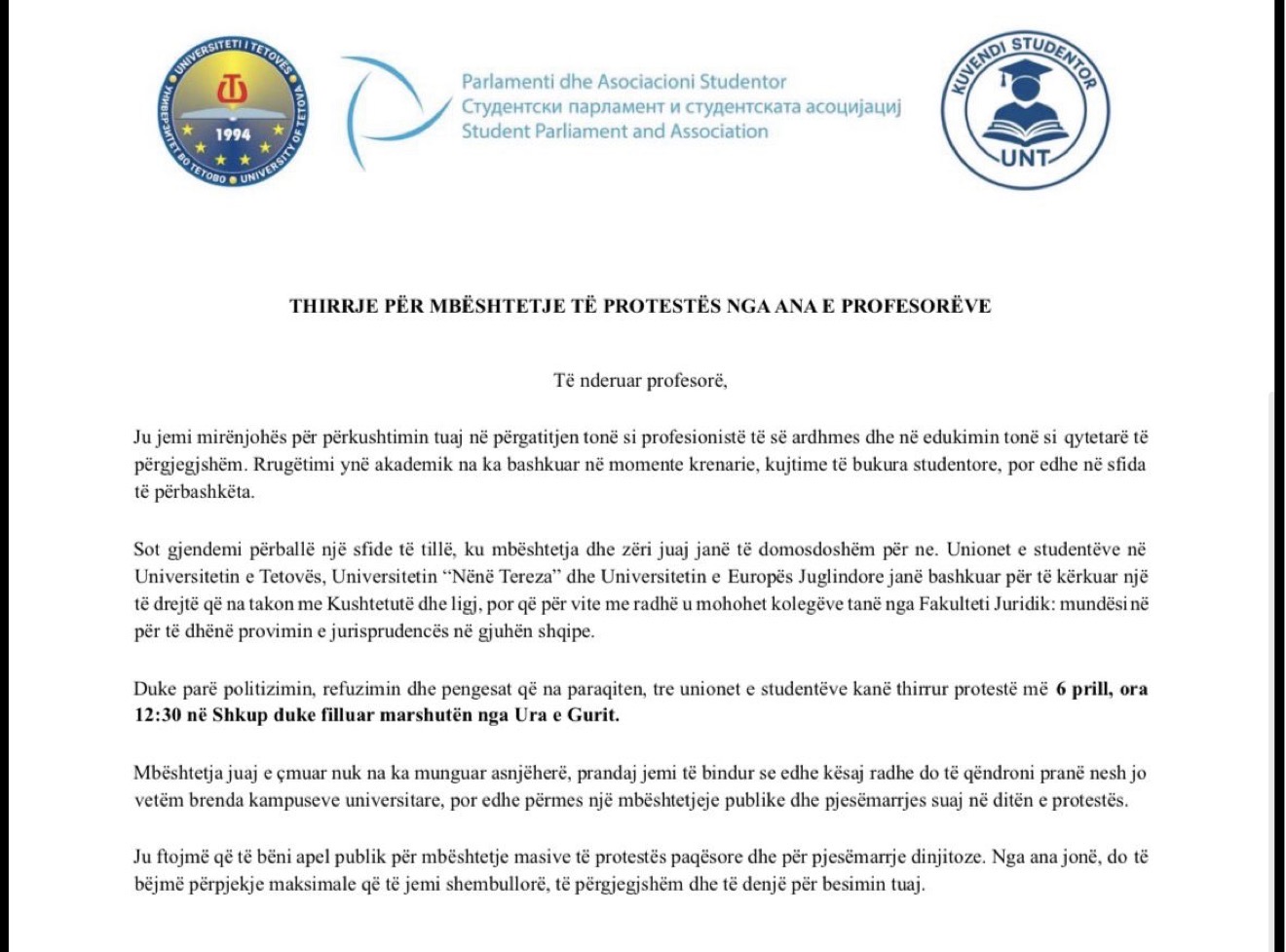 Unionet e studentëve nga Universiteti i Tetovës, Universiteti “Nënë Tereza” dhe Universiteti i Evropës Juglindore u kanë drejtuar një thirrje publike profesorëve universitarë, duke kërkuar mbështetjen e tyre për protestën e paralajmëruar që do të mbahet më 6 prill, me fillim nga ora 12:30.