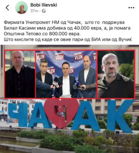 “ Kompania Unipromet NM nga Çaçaku, e cila mbështet Bilal Kasamin, ka një fitim prej 40,000 eurosh, dhe po ndihmon Komunën e Tetovës me 800,000 euro.