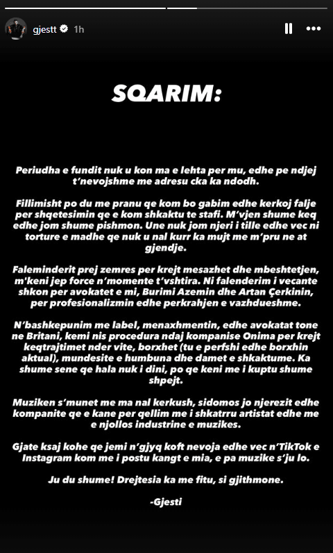 Gjatë kësaj kohe që jemi në gjyq në qoftë nevoja edhe veç në TikTok e Instagram kam me i postu këngët e mia, e pa muzikë nuk ju lë.Ju dua shumë.