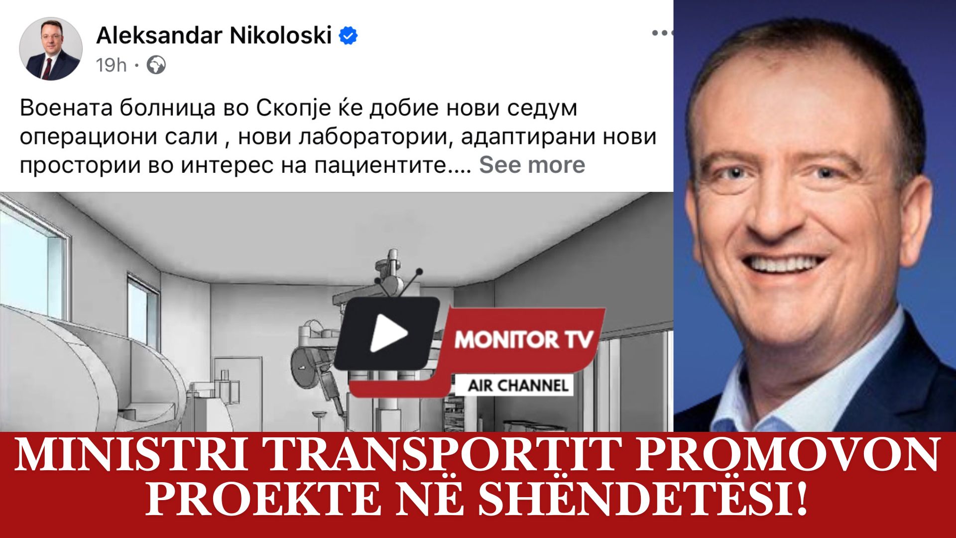 Gjatë ditës së djeshme në profilin e tij në rrjetin social Facebook, ministri për transport dhe lidhje Aleksandar Nikollovski ka prezantuar proektin për renovimin e spitalit “8 Shtatori” në Shkup i njohur ndryshe si “spitali ushtarak”.