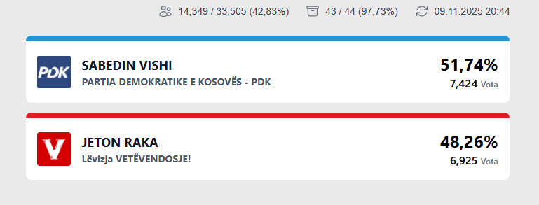 Sabedin Vishi i PDK-së po prin me 51.74%. Ndërsa, Jeton Raka 48.26% të votave