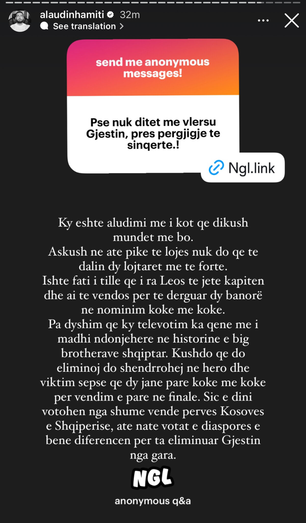 ”Ky është aludimi më i kotë që dikush mund ta bëjë. Askush në ate pikë të lojës nuk do që të dalin dy lojtarët më të fortë. Ishte fati i tillë që i ra Leos të jetë kapiten dhe ai të vendosë për të dërguar dy banorë në nominim kokë me kokë”, shkroi Hamiti.