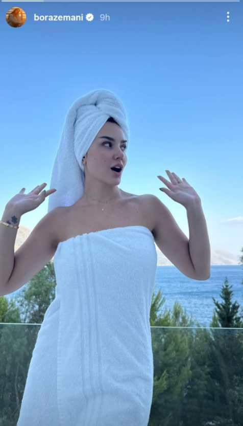 E mbështjellë me një peshqir të bardhë dhe me një pamje natyrale nga bregdeti, Bora ka marrë vëmendjen e mijëra ndjekësve të saj.