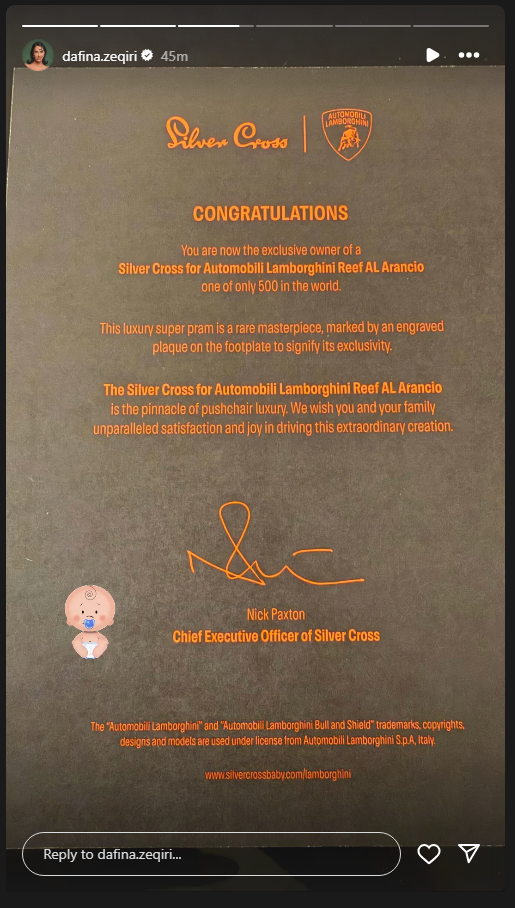 Në faqen e saj në Instagram, Dafina ka ndarë me ndjekësit që i ka blerë djalit të saj një karrocë për fëmijë Lamborghini Revuelto Arancio, e cila është një edicion i limituar në të gjithë botën, me vetëm 500 copë të këtij lloji.