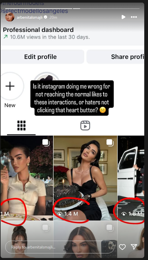 Ajo publikoi një screenshot nga profili i saj, ku shihet se ka mbi 10.6 milionë shikime vetëm në 30 ditët e fundit, megjithatë pëlqimet në postimet e saj nuk po përputhen me këto shifra të larta, shkruan Indeksonline.