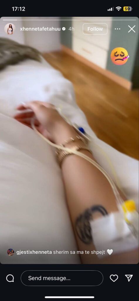 Përmes një postimi në “Instastory”, ajo ka publikuar një fotografi ku shihet duke marrë infuzion, ndërsa ndodhet në një dhomë luksoze, larg angazhimeve të përditshme.