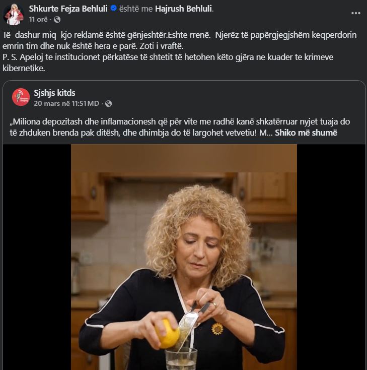 Këngëtarja e njohur, Shkurte Fejza ka bërë një reagim të ashpër publik, lidhur me një reklamë të gjeneruar me inteligjencë artificiale, por që u bë me fytyrë të saj.