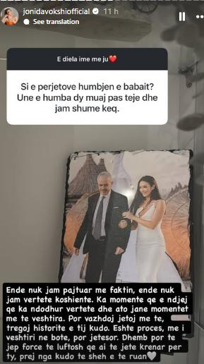 “Ka momente që e ndjej që ka ndodhur vërtet dhe ato janë momentet më të vështira.Por vazhdon të jetojë me të…Është procesi më i vështirë në botë, për jetësor. Dhemb por të jep forcë të luftosh që ai të jetë krenar për ty, prej nga kudo që të sheh e të ruan,” ka shkruar Jonida bashkëngjitur një fotografie të saj me të atin.