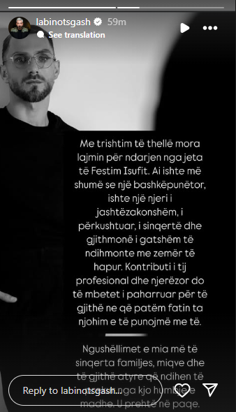 “Me trishtim të thellë mora lajmin për ndarjen nga jeta te Festim Isufit. Ai ishte me shume se një bashkëpunëtor, ishte një njeri jashtëzakonshëm, i përkushtuar, i sinqerte dhe gjithmonë gatshëm te ndihmonte me zemër te hapur. Kontributi i tij profesional dhe njerëzor do te mbetet i paharruar për te gjithë ne qe patëm fatin ta njohim e të punojmë me të. Ngushëllimet e mia me të sinqerta familjes, miqve dhe te gjithë atyre qe ndihen te prekur nga kjo humbje e madhe. U prehtë ne paqe.” Ishin fjalët e Gashit.