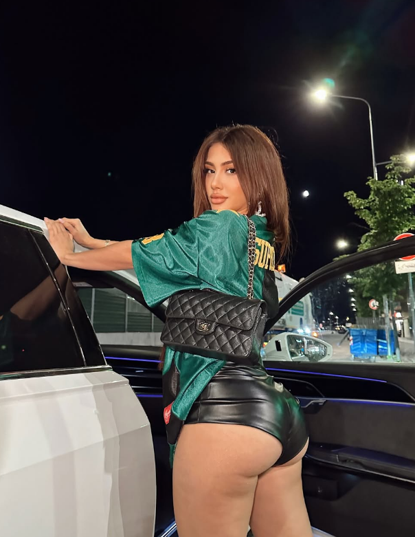 Me një palë pantollona të shkurtra prej lekur dhe një bluzë sportive, Melinda ka vendosur në qendër të vëmendjes të pasmet bombastike.