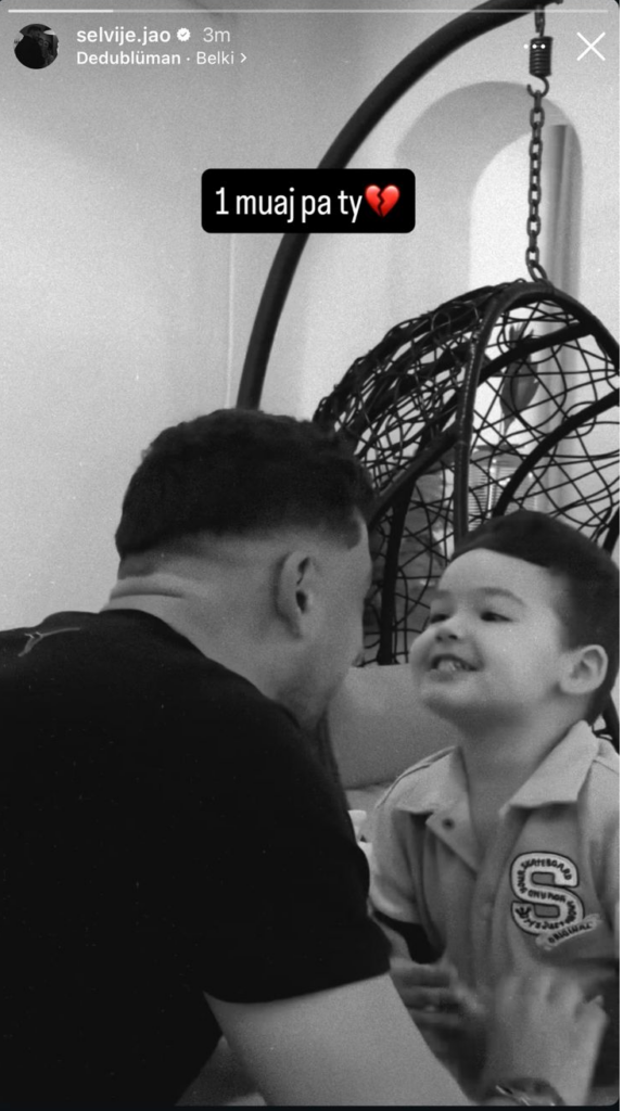 Në imazh shfaqet Shpati në një moment intim dhe të ngrohtë me djalin e tyre të vogël, Roelin, duke buzëqeshur me njëri-tjetrin.