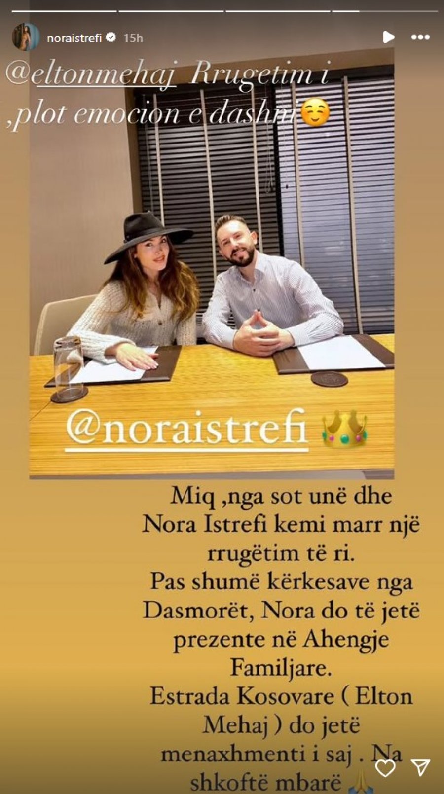 Lajmi u bë i ditur përmes një postimi në llogarinë e saj në Instagram, ku Nora Istrefi shfaqet së bashku me Elton Mehajn, një menaxher i njohur shqiptar që menaxhon disa nga emrat më të mëdhenj të industrisë muzikore shqiptare.