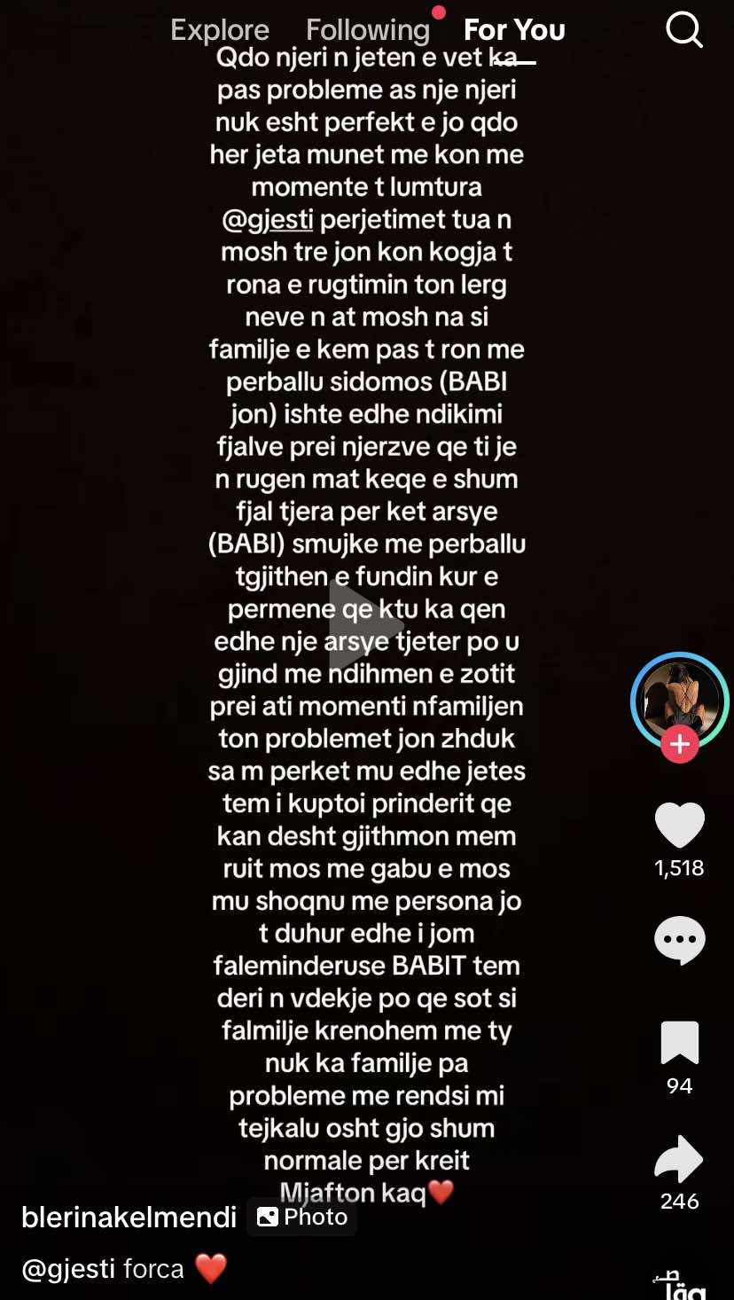 Ndërsa nuk shkoi shumë erdhi edhe reagimi i motrës së tij, ajo në ‘Tik-tok’ ka shkruar “Çdo njeri në jetën e vet ka pas probleme as një njeri nuk është perfekt, babi fjalët e tjerëve nuk mujke me i përballu ashtu ishte edhe reagimi i tij, ne jemi krenar me ty”.