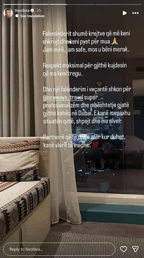 Reperi i njohur kosovar Fero ka reaguar përmes një postimi në InstaStory, pasi ka marrë një numër të madh mesazhesh nga ndjekësit e tij që janë shqetësuar për sigurinë e tij për shkak të situatës së tensionuar në rajonin ku ai ndodhet aktualisht. Përmes një mesazhi të shkurtër, artisti ka bërë të ditur se ndodhet në Dubai dhe është mirë, duke siguruar fansat se nuk ka asnjë arsye për shqetësim.
