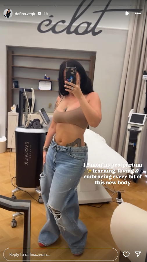 Edhe 1.5 muaj pas që u bë nënë, Dafina duket se ka pranuar dhe përqafuar këto ndryshime natyrale. Ajo ka publikuar një video në Instagram ku tregon se si trupi i saj ka ndryshuar – përjetimi që çdo nënë kalon.