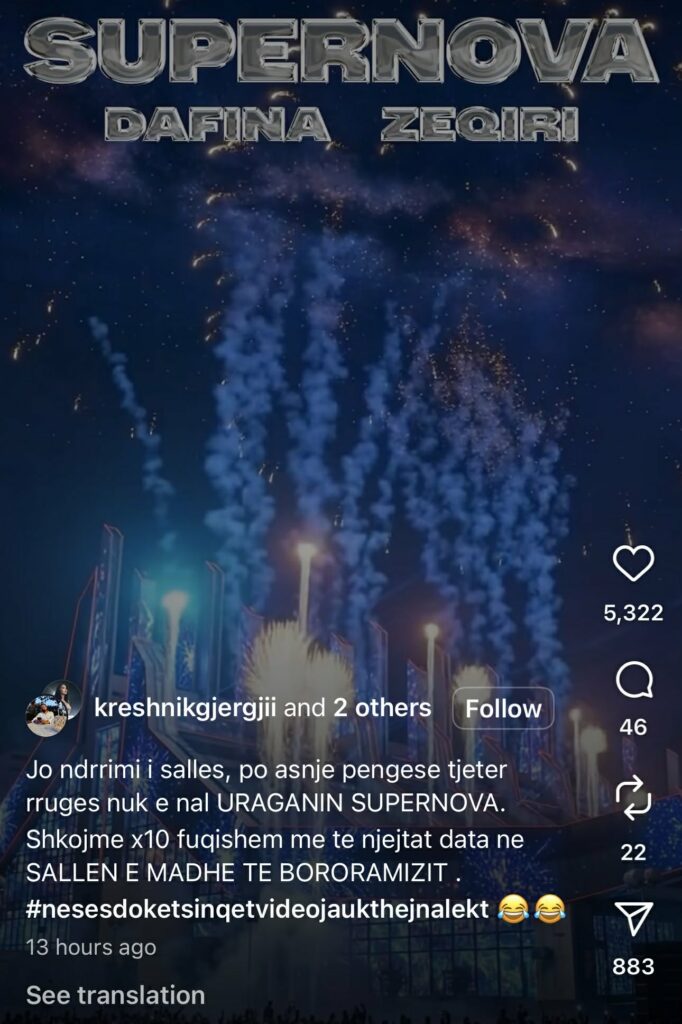 “Jo ndërrimi i sallës, po asnjë pengesë tjetër rrugës nuk e nal URAGANIN SUPERNOVA. Shkojmë x10 fuqishëm me të njëjtat data në sallën e madhe të ‘Bororamizit’”, ka shkruar ai mes tjerash.