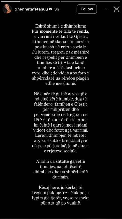 Xheneta Fetahu, ish e dashura e Gjestit, ka bërë apel që fotografitë dhe videot nga varrimi i vëllait të tij, Eldionit, të mos shpërndahen nëpër rrjete sociale.