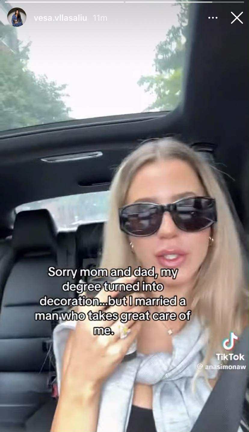 Ajo ka ndër një postim, ku thuhet “Më falni mami dhe babi, diploma ime u shndërrua në dekoratë… por u martova me një burrë që kujdeset shumë për mua.”