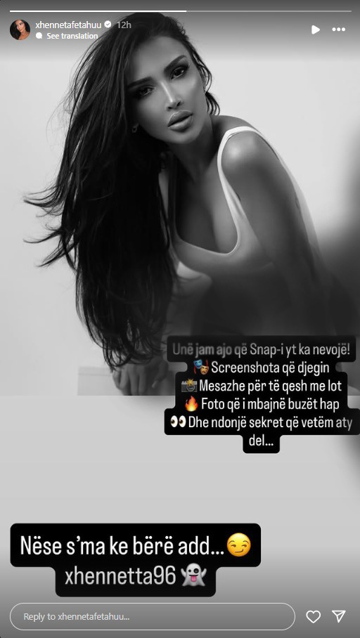 Në përshkrimin e fotografisë, Xheneta shkruan: “Unë jam ajo që Snap-i yt ka nevojë. Screenshot-a që djegin, mesazhe për të qeshur me lot, fotografi që i mbajnë buzët hapur dhe ndonjë sekret që vetëm aty del.”