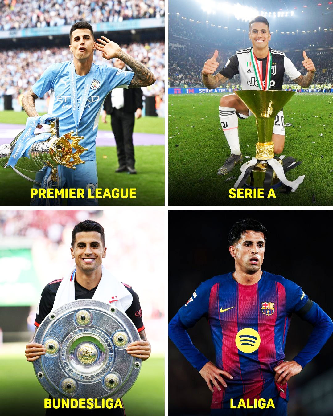 Karriera e tij ka kaluar nga Valencia tek Interi, Juventus, Manchester City, Bayern Munich dhe Barcelona, duke u bërë një nga lojtarët më “globalë” të futbollit modern. Tani, me një hap larg titullit në Spanjë, Cancelo mund të hyjë në histori si lojtari që ka fituar titullin në 4 nga 5 ligat më të mëdha të Europës.