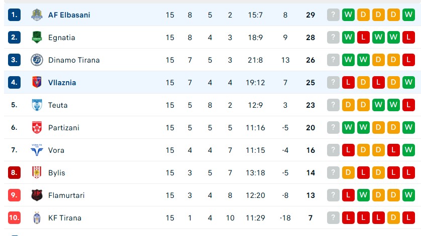 Renditja në Superiore pas 15 javësh është si më poshtë: