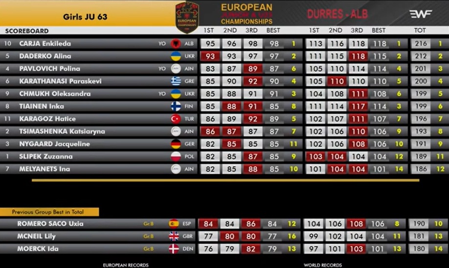 Peshëngritësja shqiptare Enkileda Carja është shpallur sot kampione e Europës në peshën 63kg, të kategorisë junior. Një rezultat i jashtëzakonshëm i shtangistes kuqezi, që në pedanën e Durrësit shkëlqeu sërish me paraqitjen e saj.