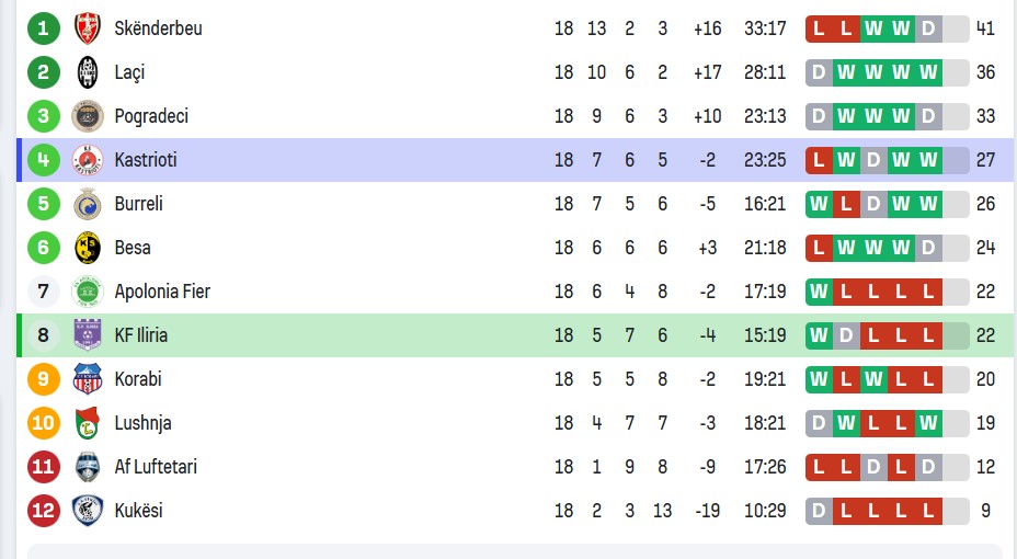 Përsa i përket renditjes, udhëheqin Skënderbeu dhe Laçi, ndërsa gara për play-off duket shumë e fortë. Renditja e plotë pas 18 javëve është si më poshtë: