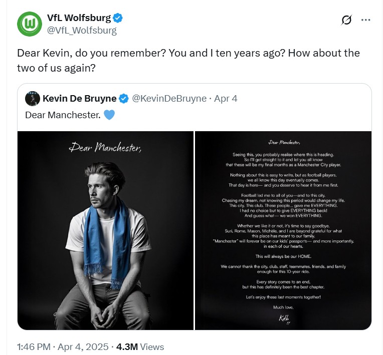 “I dashur Kevin, të kujtohet? Unë dhe ti dhjetë vjet më parë? Si mendoni për ne të dy sërish?”, ka shkruar Wolfsburg në rrjetin X.Deri tani nuk ka ndonjë reagim nga De Bruyne për këtë propozim. Për yllin belg ka interes edhe nga liga arabe si dhe nga MLS-ja.