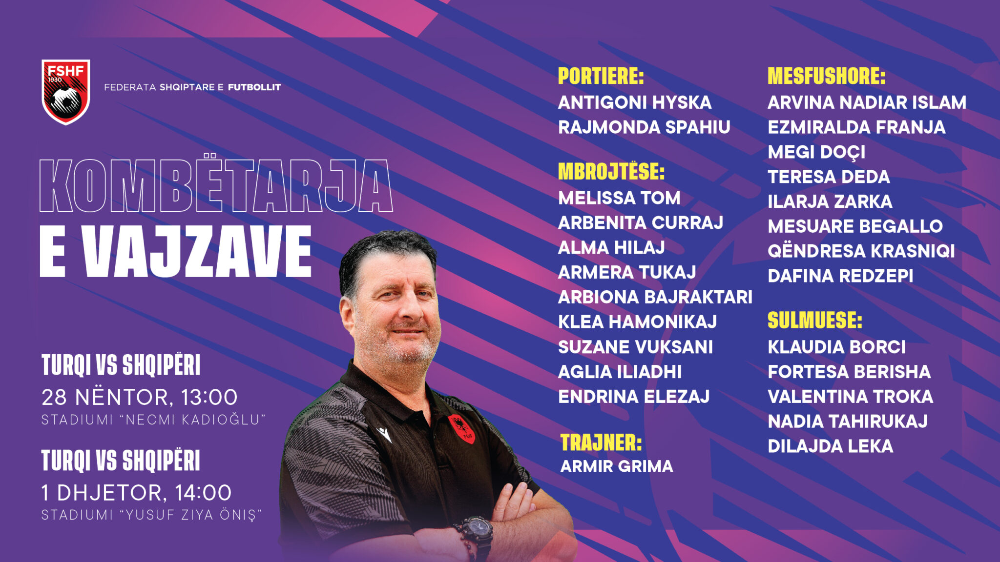 Shqipëria e vajzave do të zhvillojë dy ndeshje miqësore kundër Turqisë më 28 nëntor dhe 1 dhjetor. Skuadra e drejtuar nga trajneri Armir Grima do të nisë grumbullimin dhe përgatitjet të hënën në Tiranë, për t’u zhvendosur më pas në Stamboll, ku do të vijojë fazën përgatitore.