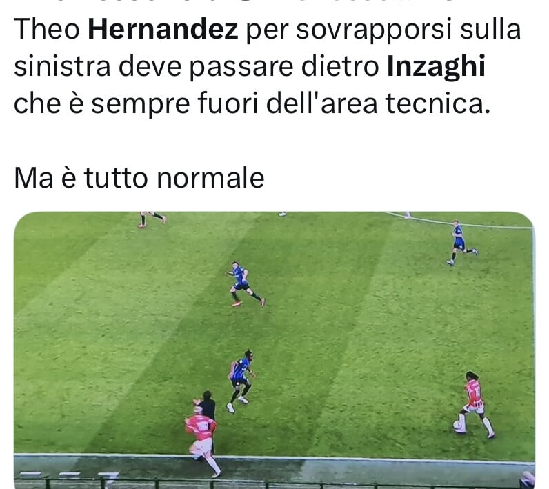 Theo Hernandez, në një depërtim nga e majta për të marrë në zotërim topin e pasuar nga Leao, u detyrua të “driblonte” edhe Simone Inzaghin, “lojtarin e 12-të” të Interit”, i cili, si zakonisht, ndodhej disa metra jashtë zonës së vet teknike.