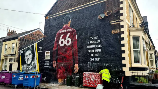 “Jam thjesht një djalë i zakonshëm nga Liverpool-i, që e ka përmbushur ëndrrën e tij”. Kjo fjali, e shkruar mbi një mur pranë “Anfield”, kishte vite që simbolizonte krenarinë e qytetit. Ishte murali dedikuar për Trent Alexander-Arnold, djalin e lagjes West Derby që u rrit duke ëndërruar të vishte fanellën e Liverpool-it, dhe e bëri realitet. Por këtë mëngjes, në prag të përballjes së shumëpritur Liverpool–Real Madrid, murali është gjetur plotësisht i dëmtuar.