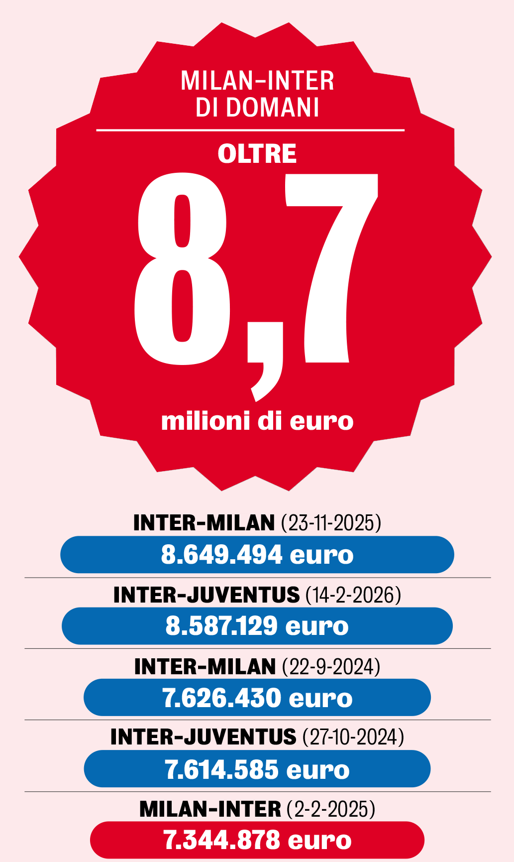 Derbi i nesërm do të shënojë ndeshjen e Serie A me të ardhurat më të larta në histori. Ende duhet të mësohet shuma e saktë, por tashmë dihet se shifra (bruto) do ta tejkalojë rekordin e mëparshëm të vendosur gjatë derbit të parë në shtëpinë e Interit, kur në kasafortën e zikaltërve përfunduan 8.649.494 euro.