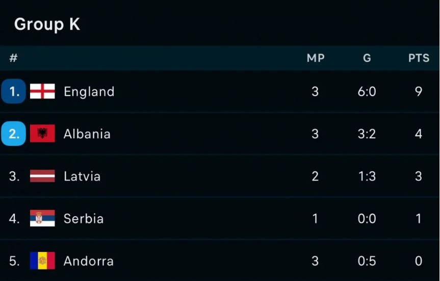 Me barazimin e sotëm, Shqipëria ruan vendin e dytë me 4 pikë në 3 ndeshje, ndërsa Serbia, renditet në vendin e katërt me 1 pikë, por me dy ndeshje më pak se kuqezinjtë. Grupi K kryesohet nga Anglia, me pikë të plota në 3 ndeshje.