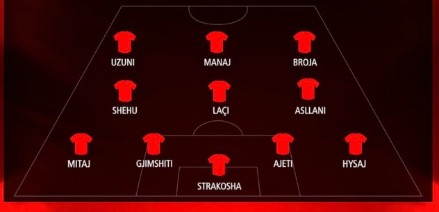 Sylvinho nuk ka lënë shumë vend për surpriza, duke rreshtuar nga minuta e parë këtë formacion titullar: Strakosha në portë, Gjimshiti-Ajeti në qendër të mbrojtjes, Mitaj dhe Hysaj në krahë, në mesfushë Shehu-Laçi dhe Asllani. Në sulm, në të majtë Uzuni, që mund të quhet edhe disi surprizë, në qendër Manaj dhe në të djathtë Broja.